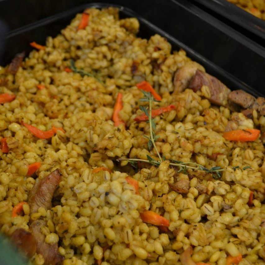 Перловка, свинина, лук, морковь, прованские травы, специи.