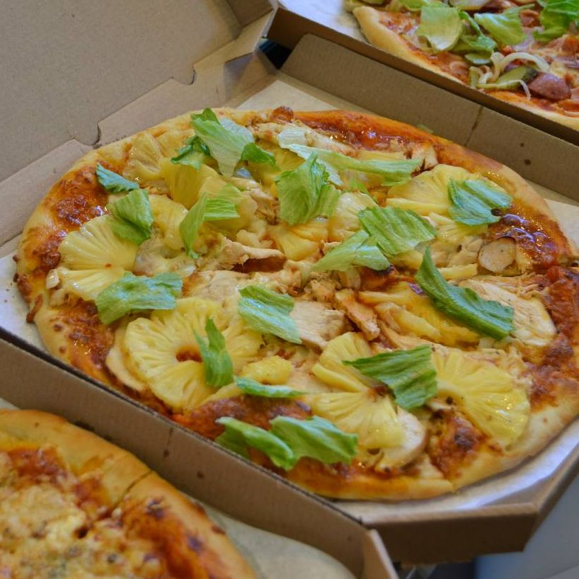 Заказать Соус Сырный, сыр Моцарелла, филе куриное в соусе Терияки, ветчина, груша, сыр Чеддер, зелень.