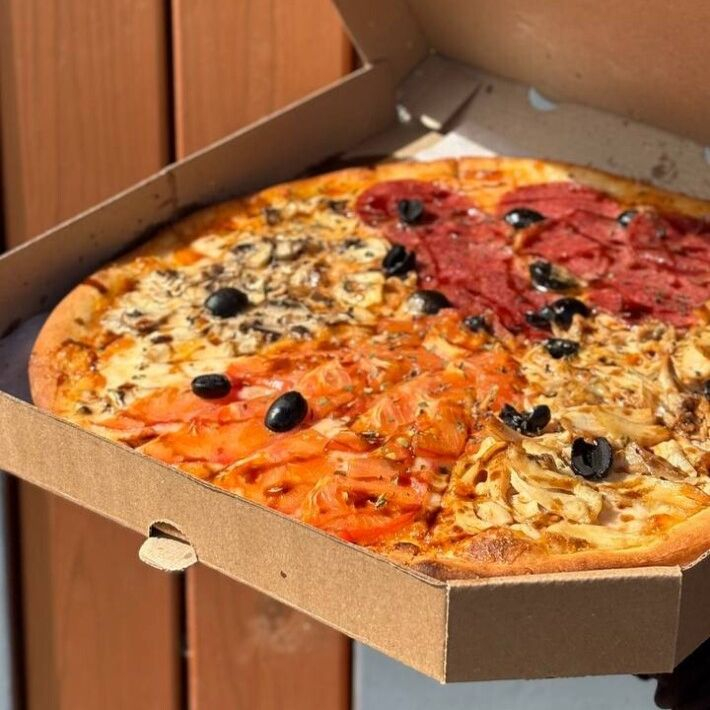 Заказать Паста томатная, сыр Моцарелла, бекон, ветчина, колбаса салями, шампиньоны, такуан, лук зеленый, шпинат.