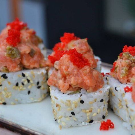 Заказать Рис, сливочный сыр, огурец, лосось слабосоленый, зеленый лук, кунжут.