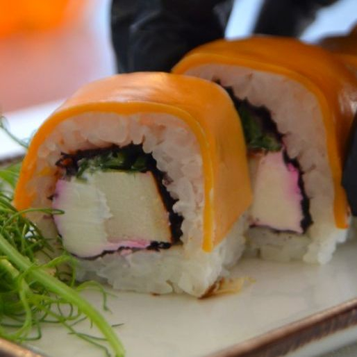Заказать Рис, сливочный сыр, филе курицы, жареное в соевом соусе, огурец, сыр Чеддер.