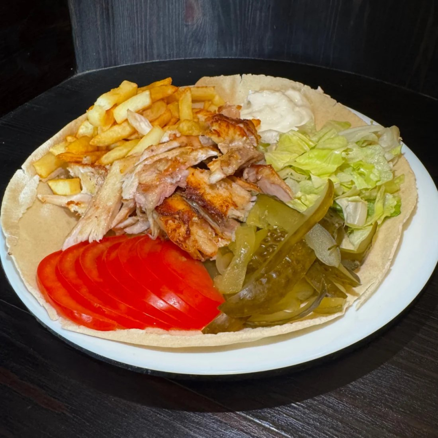 Картофель фри, ливанская лепешка, мясо птицы гриль, салат айсберг, огурец соленый, помидор, соус чесночный.