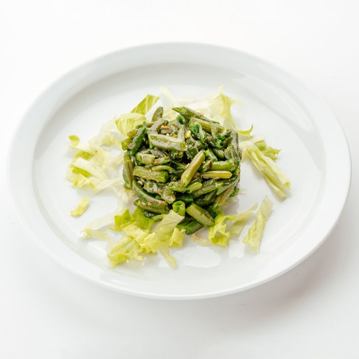 Фасоль спаржевая жареная, салатная зелень.
