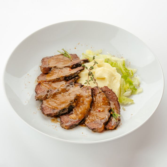 Говяжьи щеки, картофельное пюре, салатная зелень, соус Демиглас.
