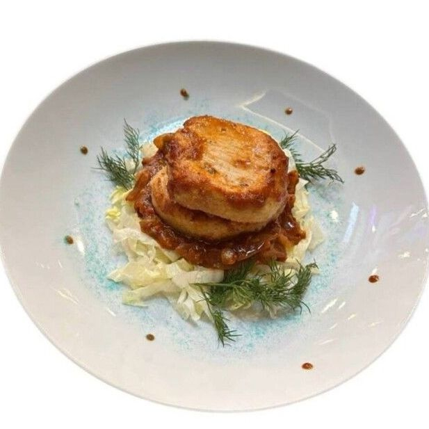 Свинина, овощи тушёные по-тайски, салатная зелень.