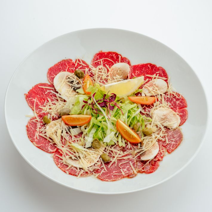 Говядина, шампиньоны свежие, томаты, сыр пармезан, салатная зелень, каперсы, лимон, соус для карпаччо, соус ореховый.