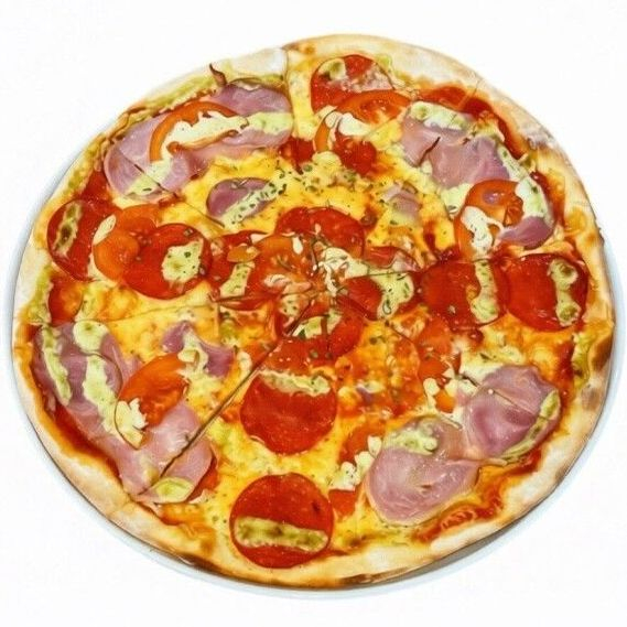 Cыр, грудинка, колбаса, соус из сметаны и чеснока, помидоры, соус для пицц, чесночный соус, орегано.