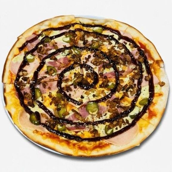 Сыр твердый, сыр моцарелла, жареное куриное филе, соус Айоли, грудинка в/к, соус для пиццы, перец свежий, лук маринованный, руккола, чесночный соус, орегано.