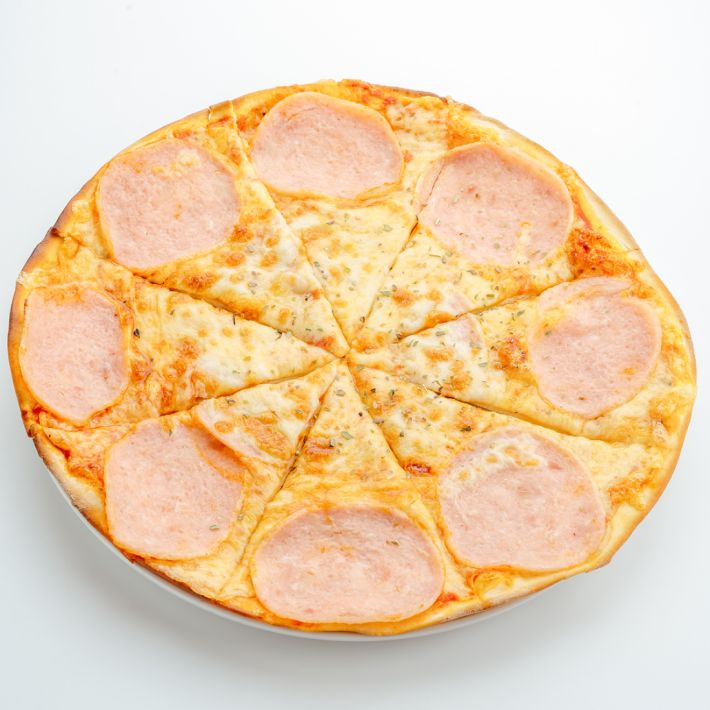 Сыр твёрдый, сыр моцарелла, ветчина, соус для пиццы, чесночный соус, орегано.