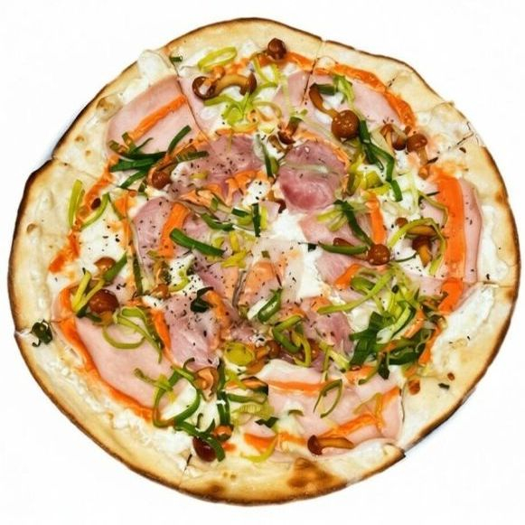 Сыр Моцарелла, копченая грудинка, маринованные опята, ветчина, лук-порей, сметана, чесночный соус, орегано.