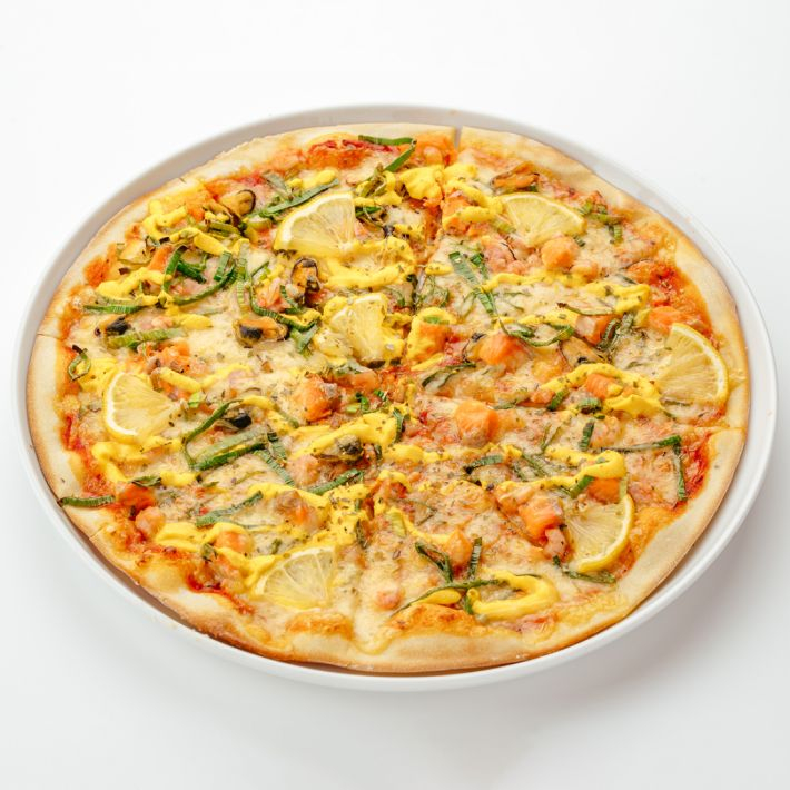 Сыр твердый, мидии, креветки, лосось с/с, лук порей, соус для пиццы, соус чесночный, лимон, орегано.