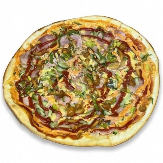 Сыр твердый, сыр моцарелла, жареное куриное филе, соус Айоли, грудинка в/к, соус для пиццы, перец свежий, лук маринованный, руккола, чесночный соус, орегано.