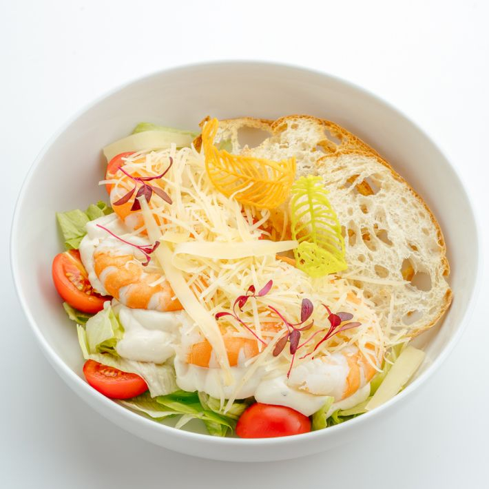 Салатная зелень, креветки, томаты, сыр пармезан, соус Цезарь, Чиабатта.