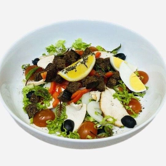 Кальмар, филе цыпленка, перец болгарский, листья салата, соус Олива, помидоры, яйцо, гренки из ржаного хлеба, маслины, лимон, зелень.