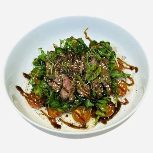 Вырезка говяжья, руккола, томаты, кунжут, соус Итальянский, соус терияки.