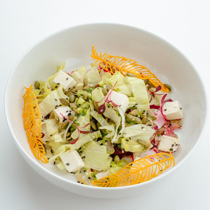 Салатная зелень, свёкла отварная, сельдерей, сыр Фета, кунжут, соус Свежая зелень.