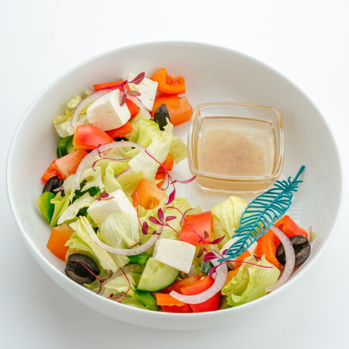 Салатная зелень, томаты, огурец свежий, перец свежий, лук красный, маслины, сыр Фета, соус Олива.