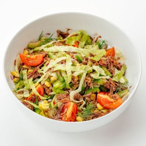 Говяжьи щеки, салатная зелень, кукуруза, перец свежий, томаты, лук красный, авокадо, соус Фирменный.