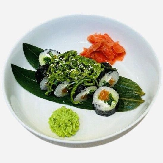 Рис, лосось, васаби, чука, нори, ореховый соус, имбирь, творожный сыр, кунжут.