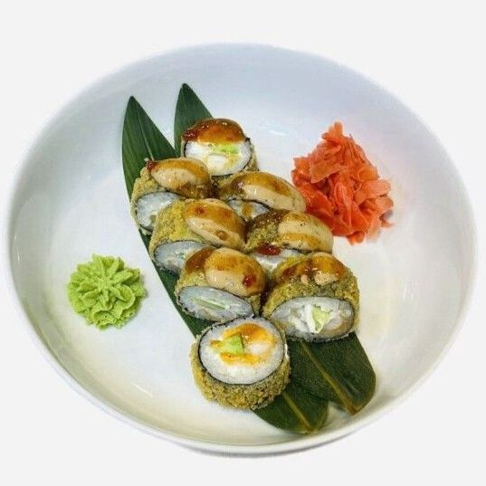 Рис, креветка, темпура, творожный сыр, авокадо, нори, соус сладкий чили, соус кунжутный.