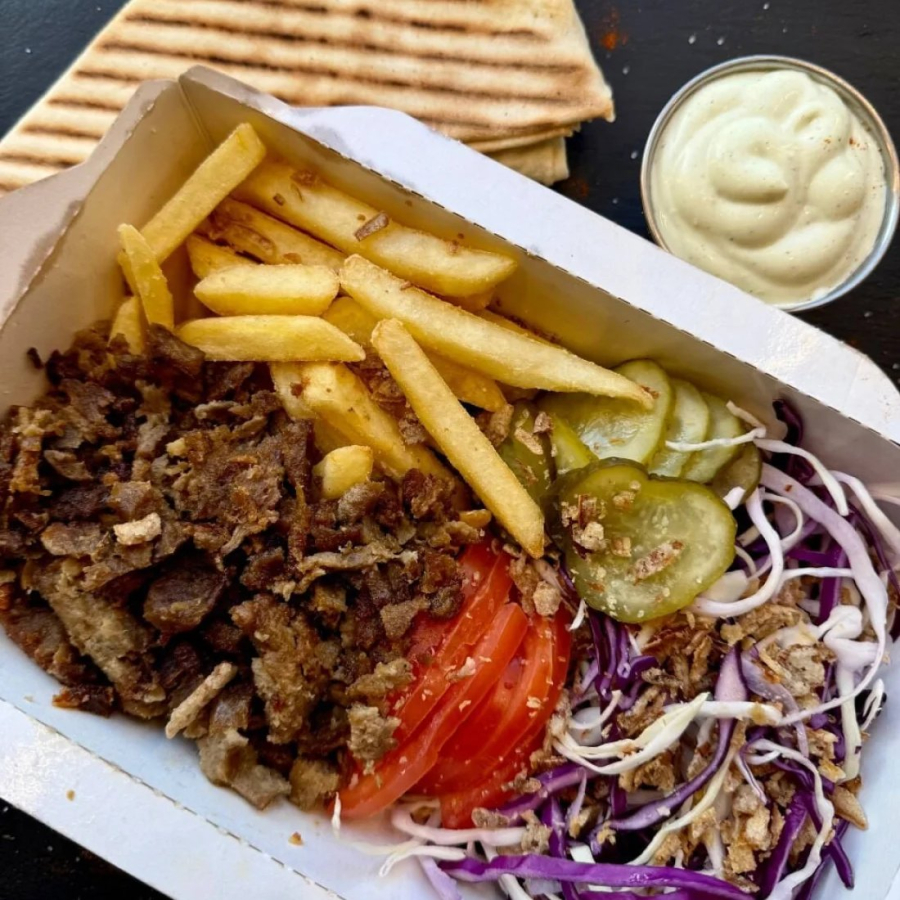 Заказать Лаваш, капуста, помидор, огурец маринованный, говядина, картофель фри, лук криспи, соус Фирменный.