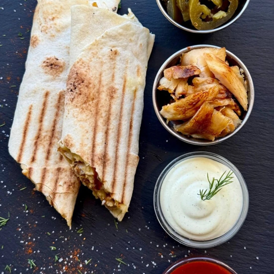 Лаваш, курица, соус Фирменный, сыр Моцарелла, соус Цезарь.
