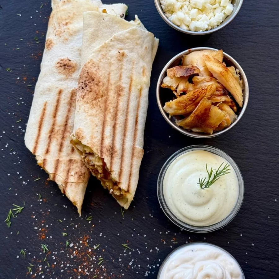 Лаваш, курица, соус Фирменный, сыр Моцарелла, соус Цезарь.