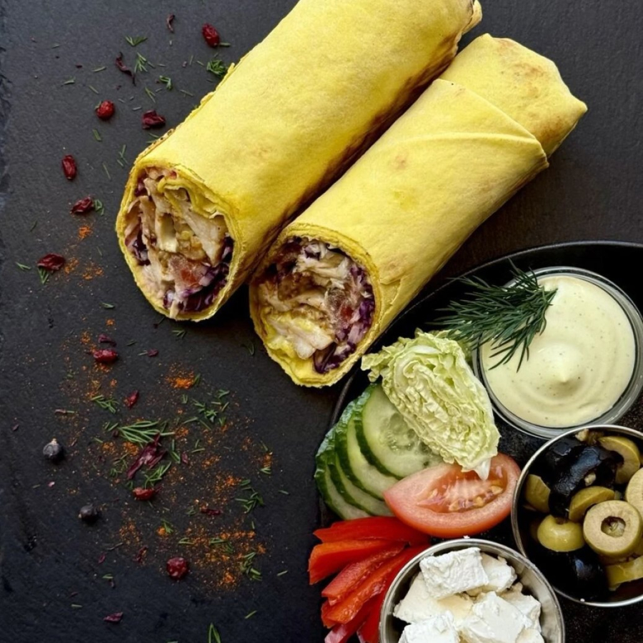 Заказать Лаваш, курица, фирменный соус, пекинская капуста, помидор, огурец, болгарский перец, маслины, сыр Фета.