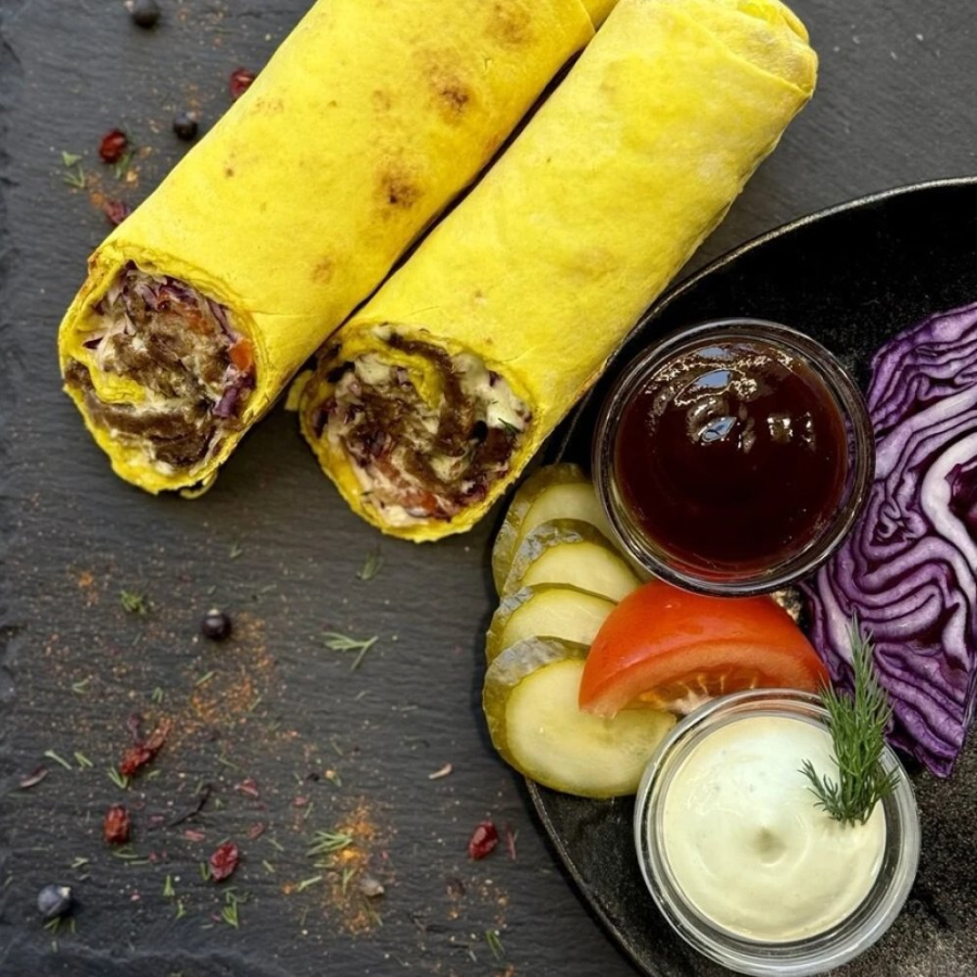 Заказать Лаваш, говядина, фирменный соус, капуста, помидор, маринованный огурец, соус Барбекю.
