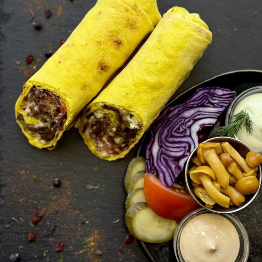 Заказать Лаваш, говядина, фирменный соус, капуста, помидор, маринованный огурец, соус Грибной, опята маринованные.
