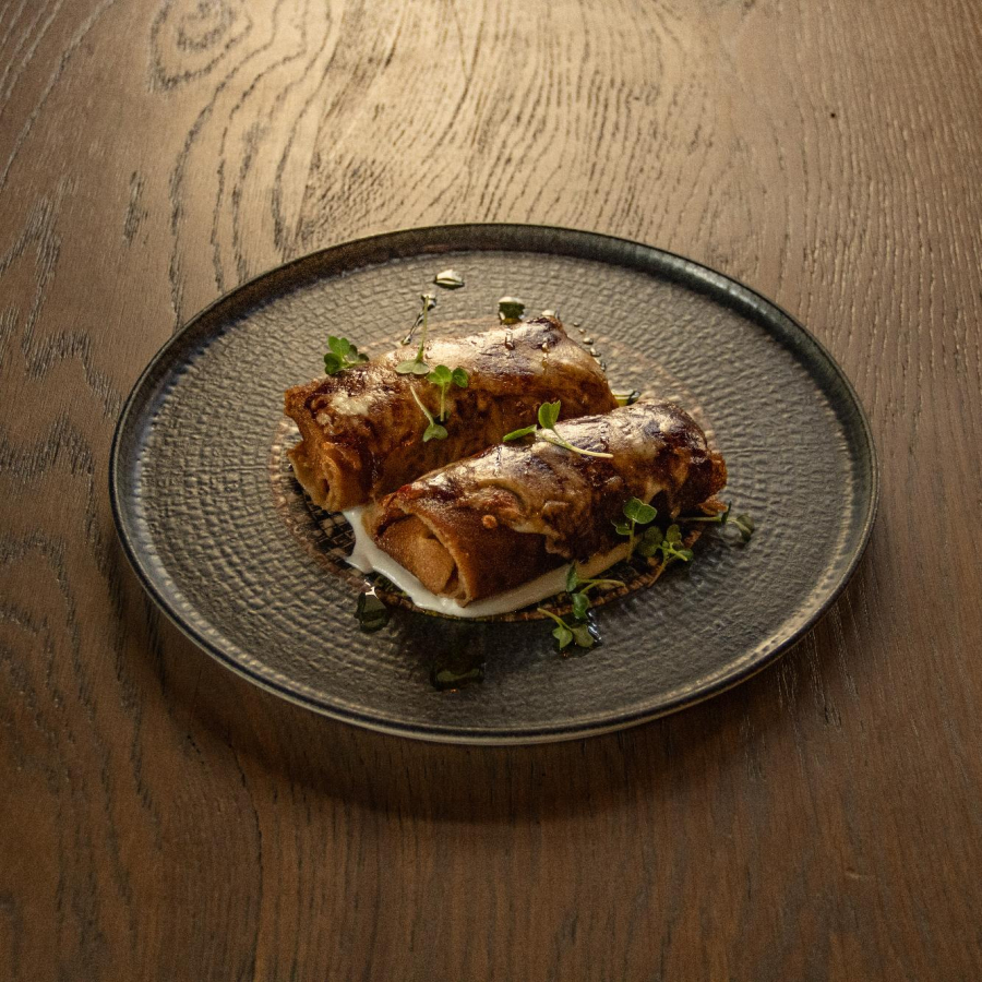 Гречневые блины, начинка из разварной говядины с гречкой, жареным луком, соусом бешамель и твердым сыром, соус сладкий чили, соус демигляс, моцарелла, соус бешамель, лук жареный сушенный, масло зеленое из петрушки, микрозелень.
