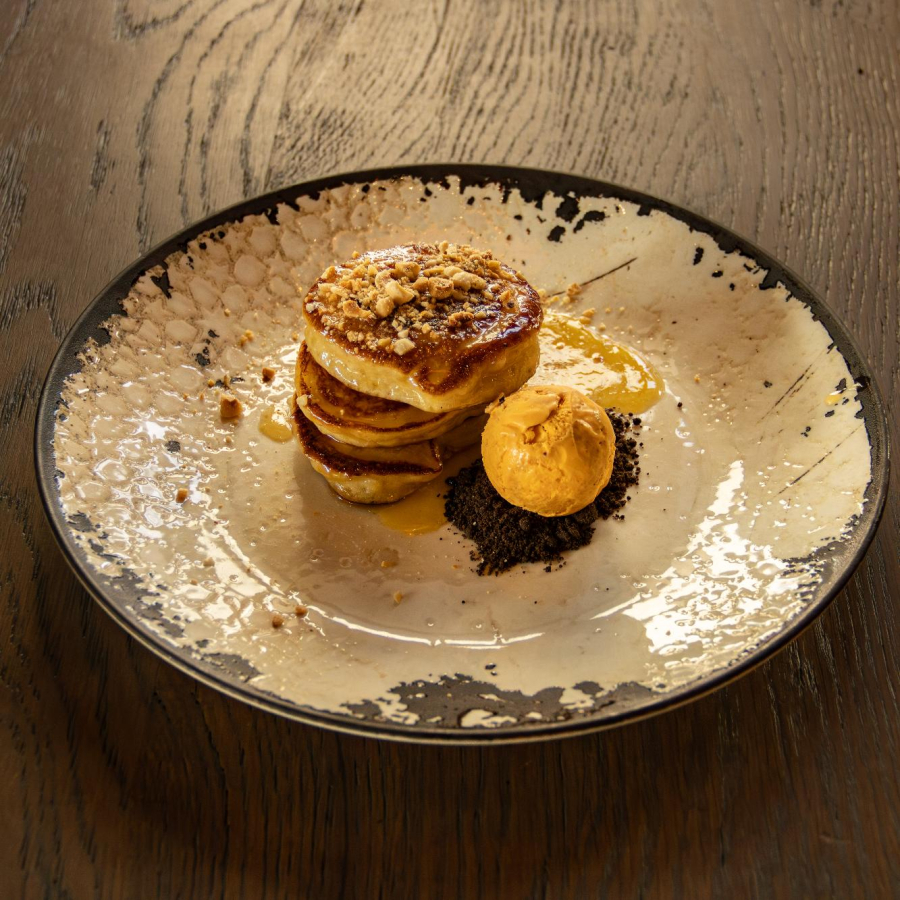 Пышные оладьи в апельсиновой глазури с облепиховым мороженым, колотыми орехами и шоколадным бисквитом