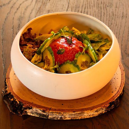 Заказать Маринованный в томатном соке томат, микс салата, заправка на основе мёда, соуса сладкий чили, французской горчицы, соевого соуса и винного уксуса, огурец свежий, редис, каперсы, масло из петрушки, микрозелень.
