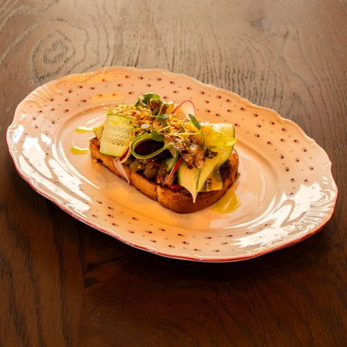 Заказать Луста на белом хлебе с соте из маринованных овощей, свежим огурцом, орехами и горчично-медовой заправкой.