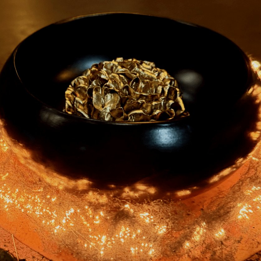 Морковный бисквит, сыр Кремчиз, сливки, грецкий орех, соленая карамель, розмарин.