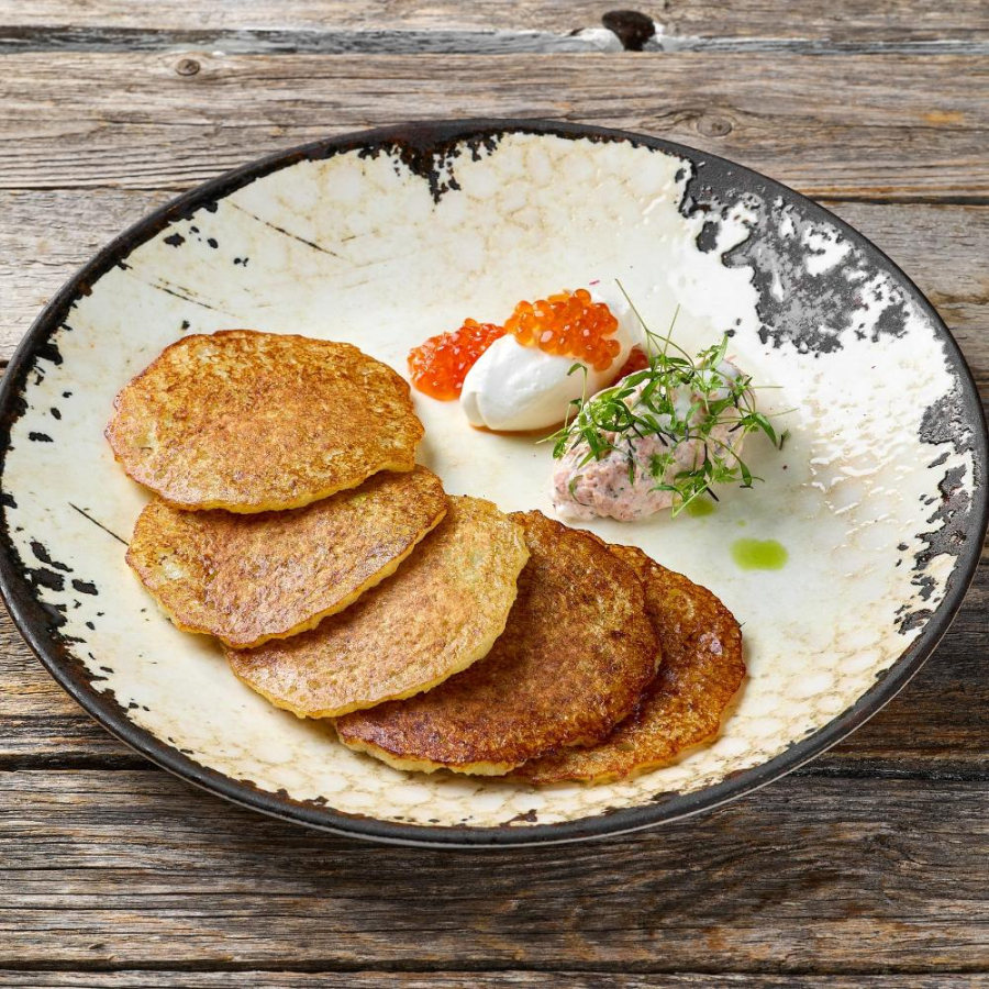 Заказать Драники с красной икрой, подвесной сметаной и рийетом из лосося, Литвины - Минск