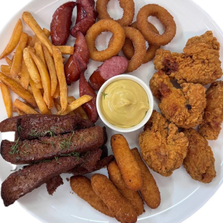 Заказать Гренки чесночные, сырные палочки, картофель фри, крылышки куриные, луковые кольца, мюнхенские колбаски, соус.