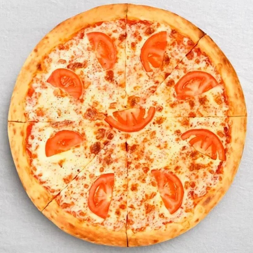Заказать Соус, сыр моцарелла, шампиньоны, ветчина, курица, колбаса пепперони, помидор, маслины.