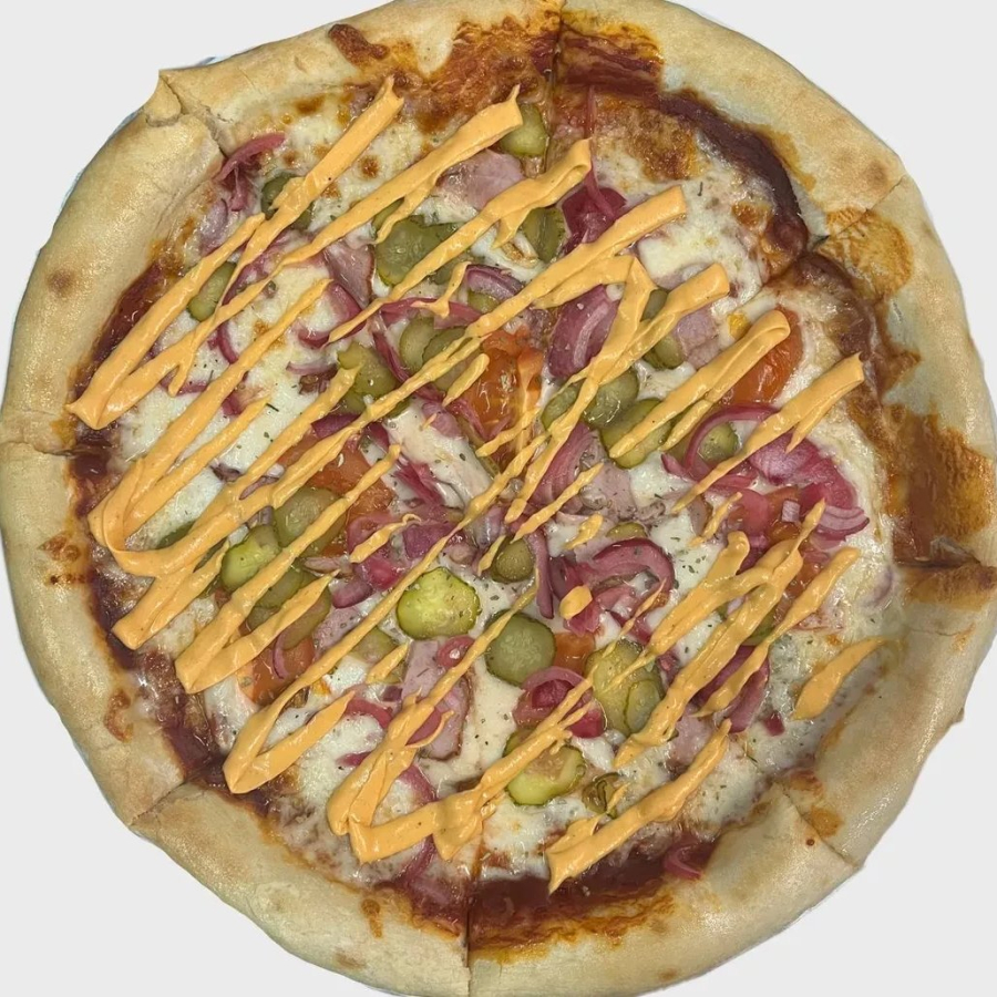 Заказать Соус, сыр моцарелла, ветчина, томат, соленый огурец, маринованный лук, соус бургер.