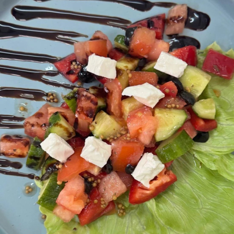 Заказать Огурец, помидор, сыр фета, маслины/оливки, лук красный, перец болгарский, салат айсберг, бальзамический соус, масло заправочное.