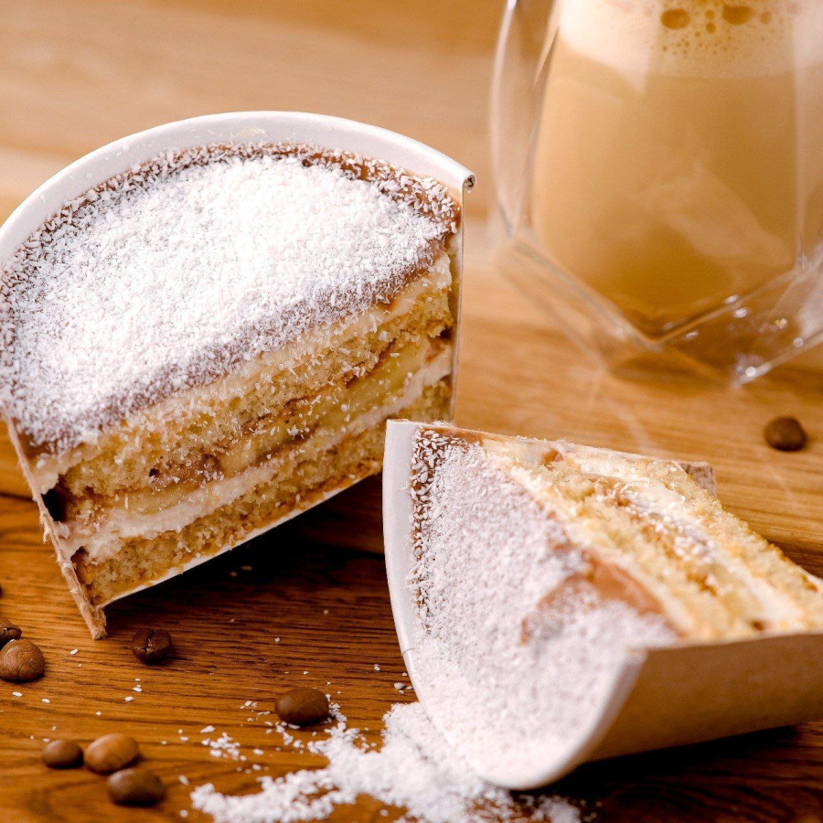 Банан, сливки, бисквит, кремчиз, молочный шоколад, сахар, кокосовая стружка.