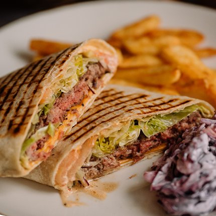 Заказать Тортилья с говяжьей котлетой, томатами, салатом айсберг, красным луком, сыром чеддер, соусом гриль и спайси. Подается с картофелем фри и салатом коул слоу.