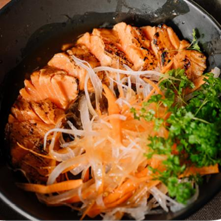 Заказать Лосось в азиатском соусе понзу, подается с салатом из дайкона и морковью.
