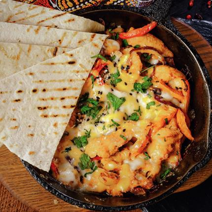 Мексиканские куриные ломтики, жареные на гриле с болгарским перцем, красным луком, кукурузой и сыром. Подается с тортильей и соусом пико де гайо и копченой сметаной.