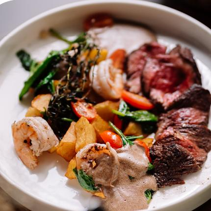 Оригинальное сочетание стейка из говядины с креветками на гриле со сливочно-перечным соусом. Подается с жареным картофелем.