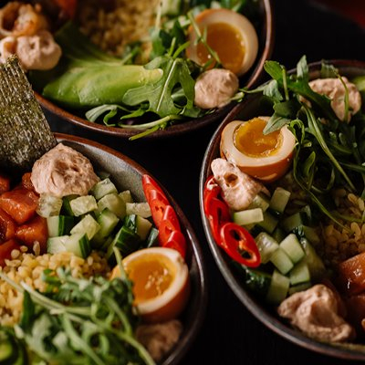 Булгур, нори, эдамаме, авокадо, огурец, рукола, маринованное яйцо, перья чили перца, крем кимчи.