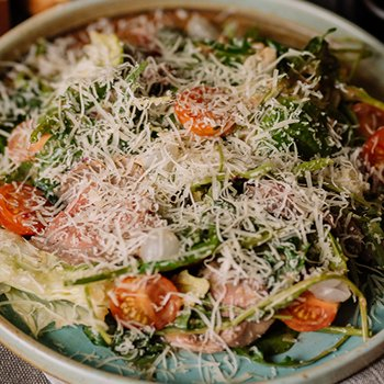 Ростбиф, запеченный картофель, томаты черри, шпинат, рукола, жемчужный лук, пармезан, заправка луковым соусом.
