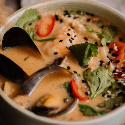Cуп том-ям с кокосовыми сливками, креветками, кальмаром и мидиями. Подается с рисом.