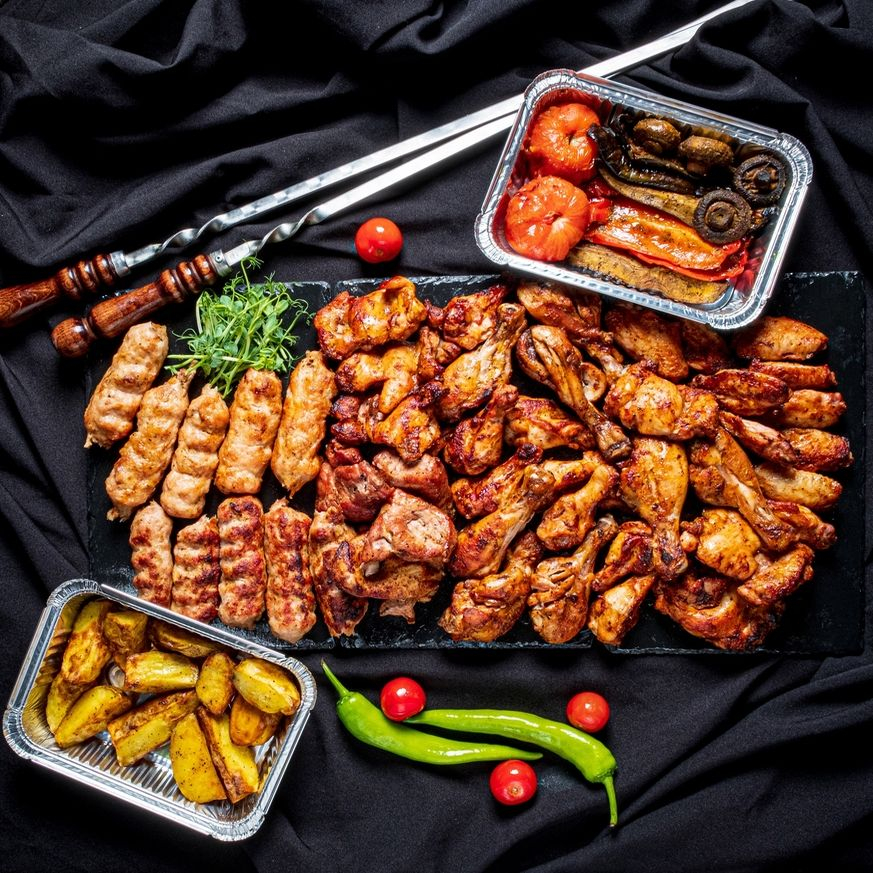 Куриные крылья, куриные ножки, люля-кебаб из свинины, люля-кебаб из курицы, мякоть бедра, свиной окорок, овощи, картофель, лаваш, лук, зелень.