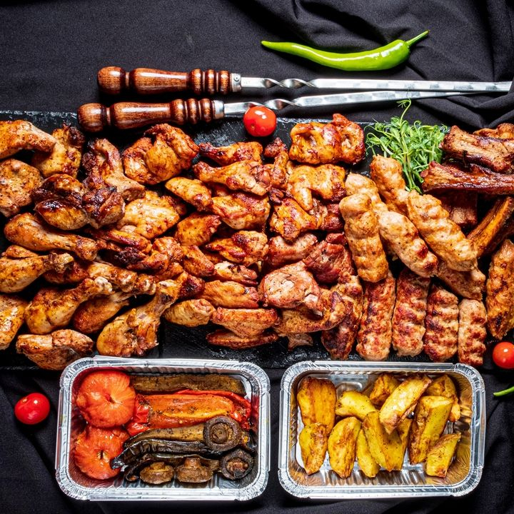 Куриные крылья и ножки, свиные ребра, картофель фри, шашлычный соус, лаваш, лук, зелень.